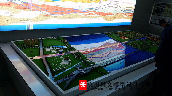 模型主要表現(xiàn)地鐵6號(hào)線過(guò)江隧道盾構(gòu)軌跡及項(xiàng)目周邊實(shí)際關(guān)系;沙盤采用平面剖視方法制作,盾構(gòu)道內(nèi)設(shè)置2臺(tái)小比例盾構(gòu)機(jī),真實(shí)模擬現(xiàn)場(chǎng)施工場(chǎng)景,盾構(gòu)方向采用動(dòng)態(tài)燈光示意,江面采用仿真動(dòng)態(tài)水制作。